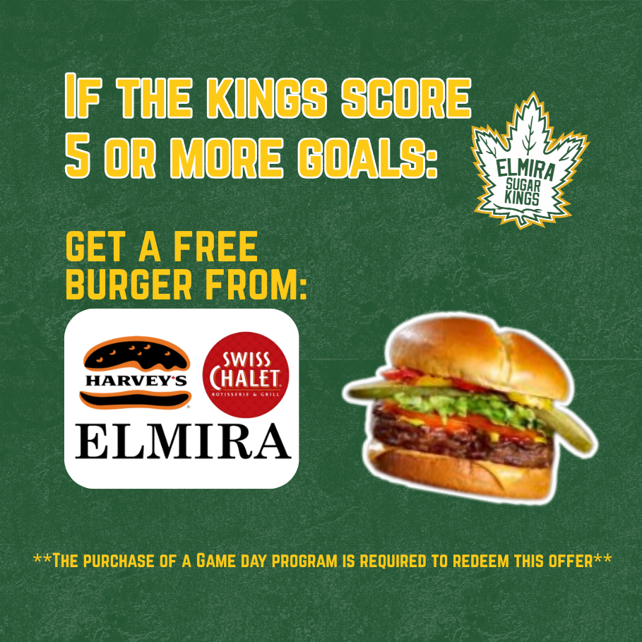 FREE Burger from Elmira Harvey's At any home game if the Kings score 5 or more goals you get a FREE Harvey’s hamburger with the purchase of a Sugar Kings game day program. Only available within 48 hours of game time at the Elmira location.