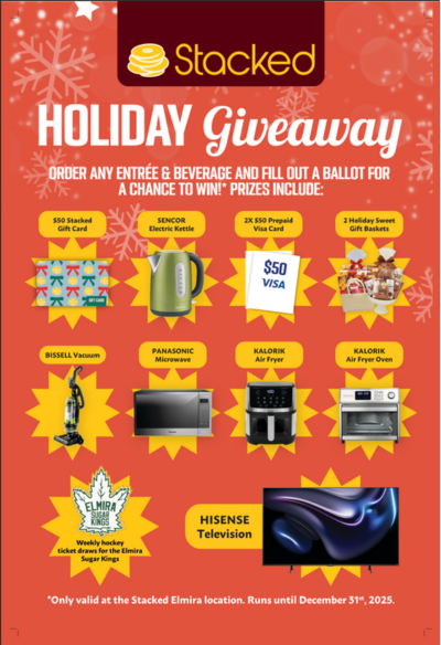 Elmira Stacked is giving away Elmira Sugar Kings tickets weekly over the month of December! Order any Entree and Beverage and fill out a ballot for the chance to win! […]