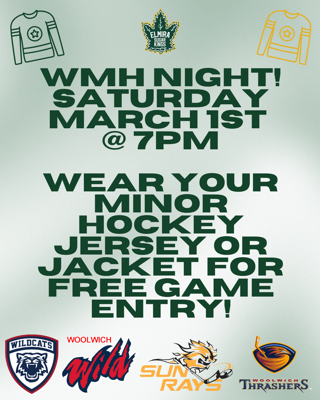 Main, News WMH Night! 03/01 by kendrabarnai February 24, 2025February 25, 2025 Attention Woolwich Minor Hockey! Join us this Saturday March 1st at 7pm for our WMH night! All minor hockey players will get free entry if jersey or jacket is worn. Hope to see you there!
